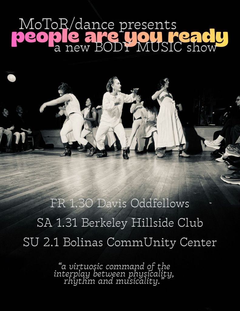 This past week, I got to check in with the collaborators for People Are You Ready, the latest project of Oakland based ensemble MoToR/dance. Today we hear from several of the collaborators: Evie Ladin, Valerie Gutwirth, Tammy Chang, Keira Armstrong, Heather Arnett, Dana Gerstein, and Dean Bosche. There are a few seats left for the Davis (Jan 30) and Bolinas (Feb 1) performances; there will be standing room only opportunities in Berkeley the day of (Jan 31, 4pm and 7pm).
